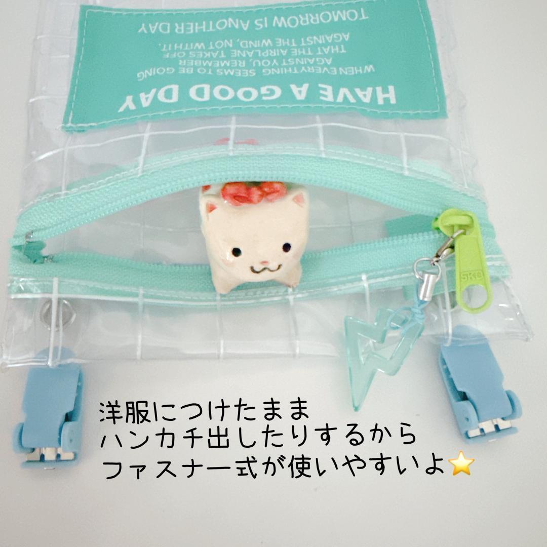 クリップでお洋服にパチンと付けるか、ポシェット用の紐で斜めかけができます。入園入学の必須アイテムです♪